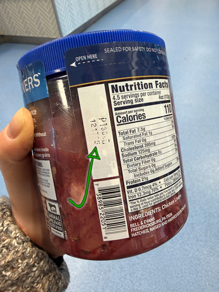 The “use by” date is on the back of the chicken livers package, in the white space pictured below.